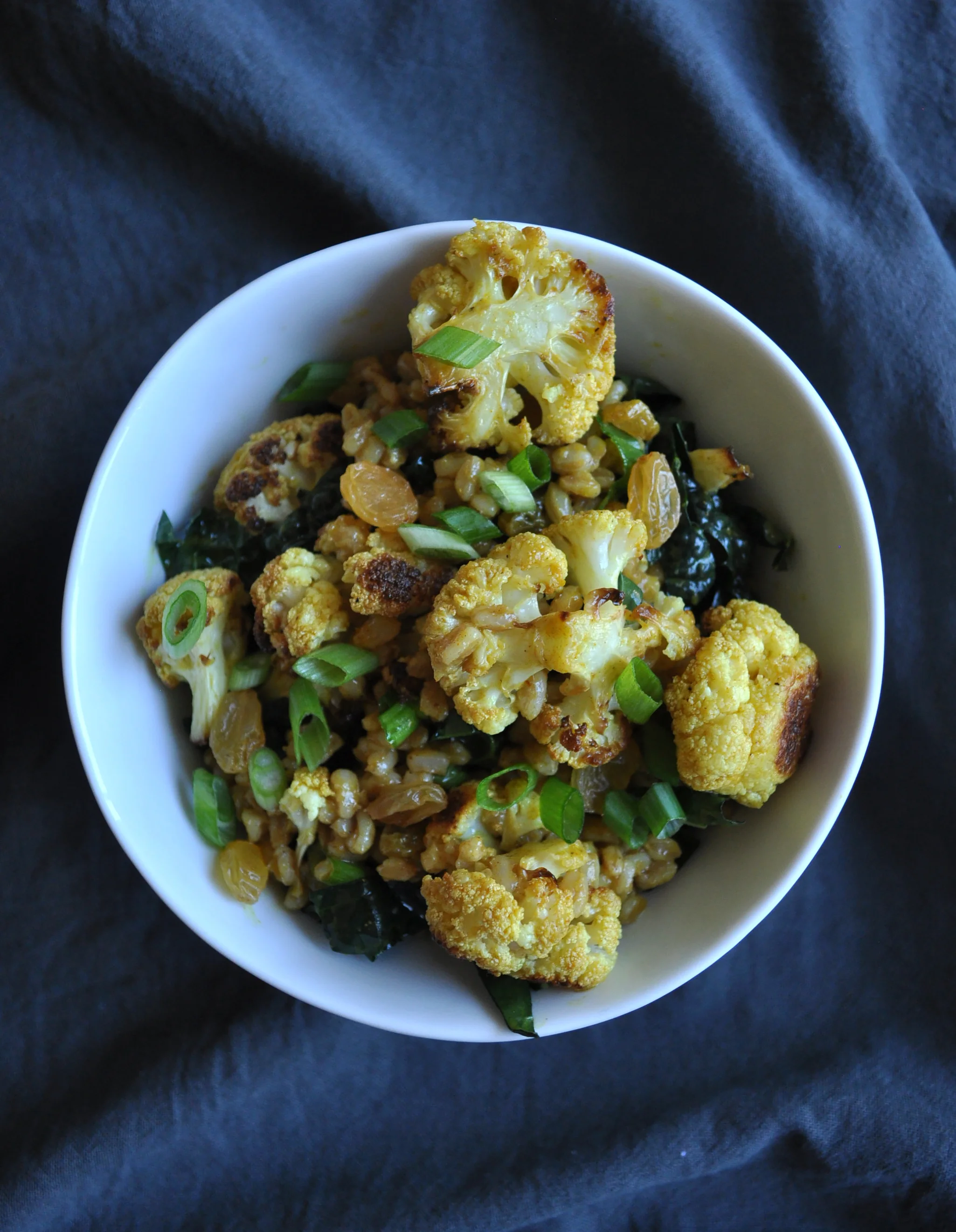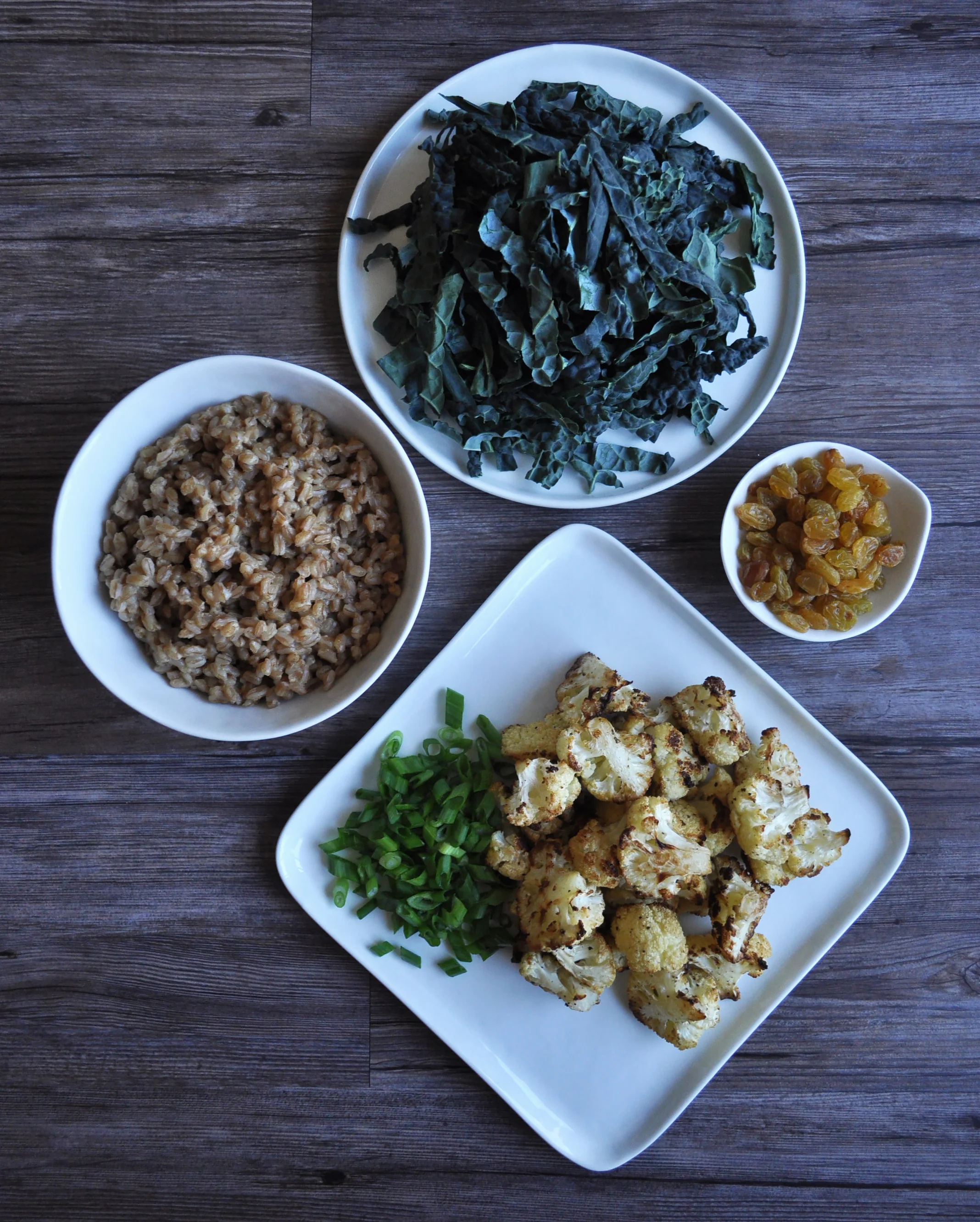 Once the cauliflower is done, add to the bowl and mix with kale and farro. Pour dressing and mix until combined. Serve warm, or chill for later. It’s great either way!